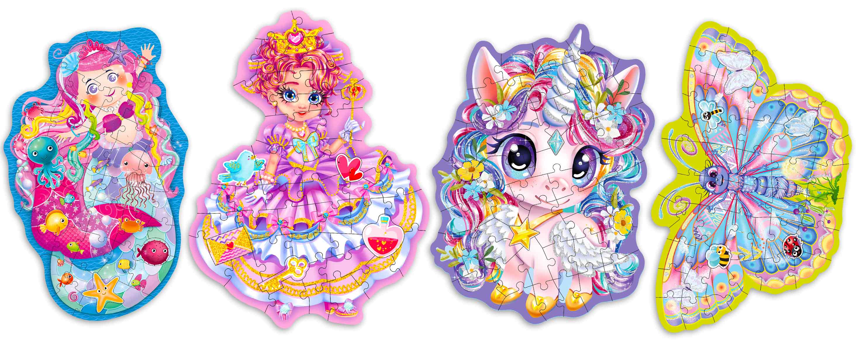 4x48 Pcs Shaped Puzzles with Glitter Effect - Princess, Unicorn