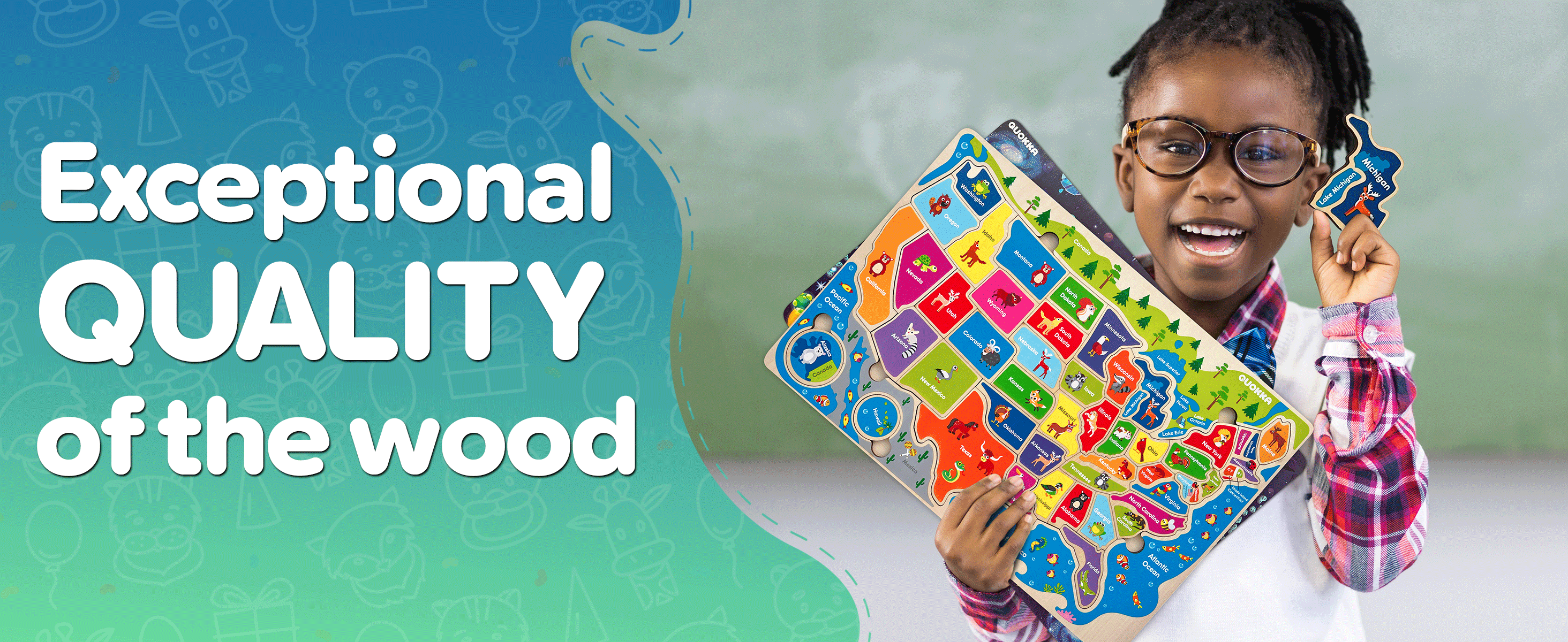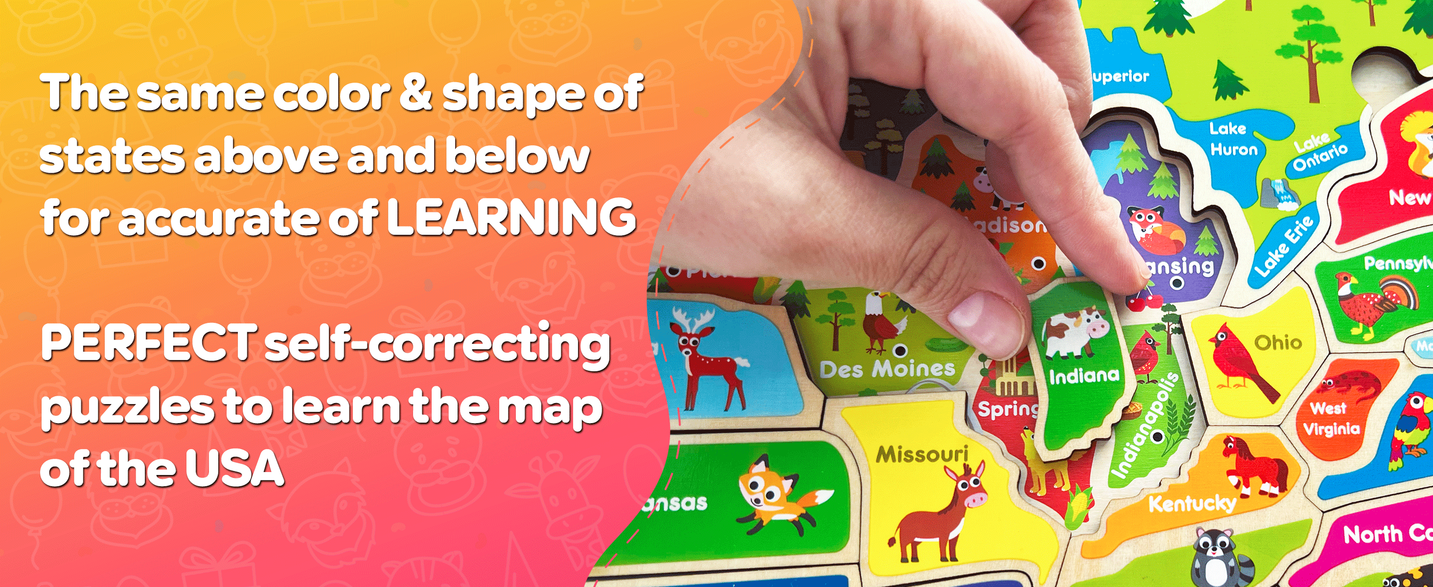 ➁ Wooden jigsaw puzzles "The United States" to learn about 50 American states and their capitals on 42 puzzle pieces.