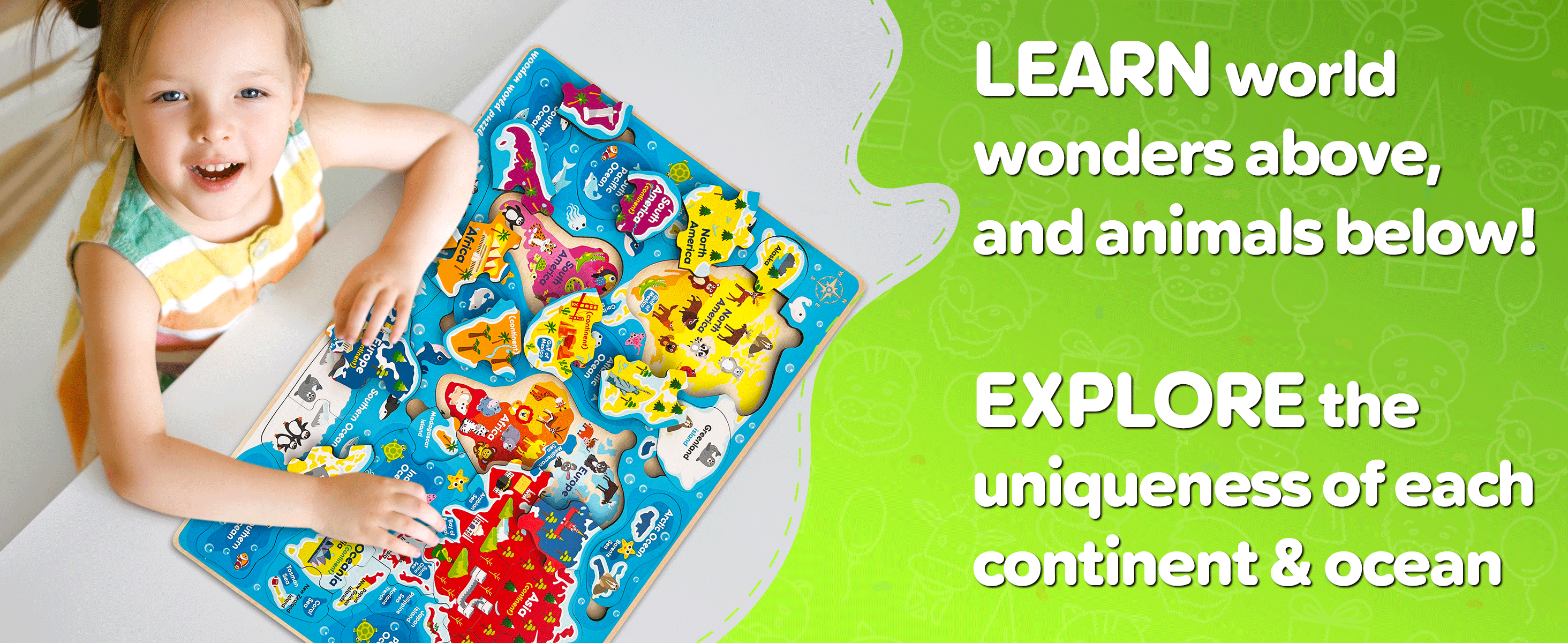➀ Wooden jigsaw puzzles "World Map" to learn about our world with 38 big wooden puzzle pieces with countries, oceans, wild and ocean animals.